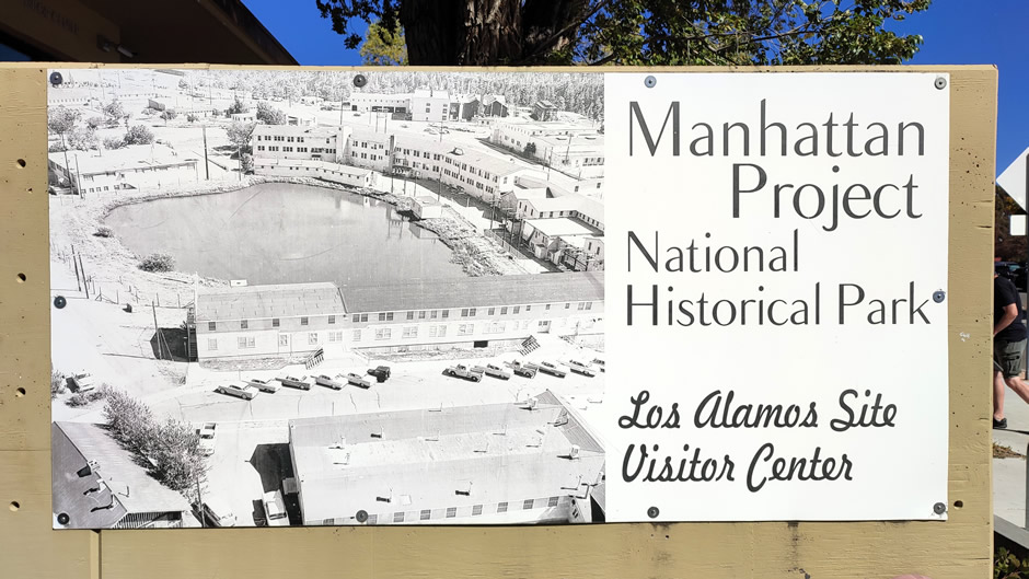 Today, the Manhattan Project National Historical Park, established in 2015, preserves this legacy across the three locations. At Los Alamos, the park encompasses 17 sites within Los Alamos National Laboratory and 13 sites in Downtown Los Alamos, reflecting both the scientific and the community life of the wartime “secret city”. Sites within the secure Los Alamos National Laboratory area (e.g. Pond Cabin, Battleship Bunker, Slotin Building, Gun Site, and V Site) are not open to the general public (a few limited guided tours are offered with tickets allocated on a “lottery-style” basis, U.S. citizens at least 18 years old only). However, visitors can explore the Downtown Los Alamos sites via a walking tour, beginning at the visitors centre next to Ashley Pond, the heart of the wartime community. The visitor centre (or “Visitor Contact Station”) provides an excellent place to ask any questions about the Manhattan Project National Historical Park and staff here are happy to guide visitors toward the historic sites. There are also walking tour maps available free of charge, as well as other informative literature to pick up. The centre also contains exhibits introducing visitors to the wartime “secret city”, highlighting the significance of Los Alamos in nuclear history.