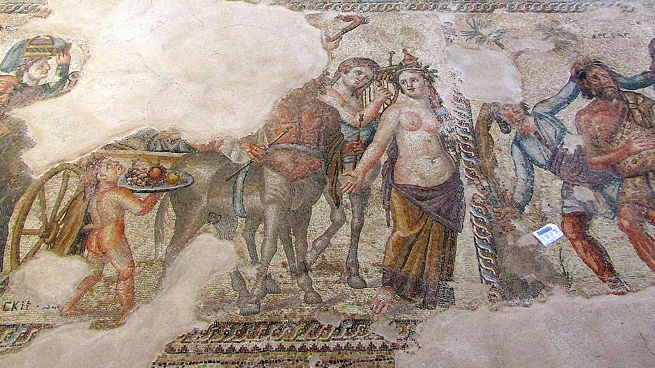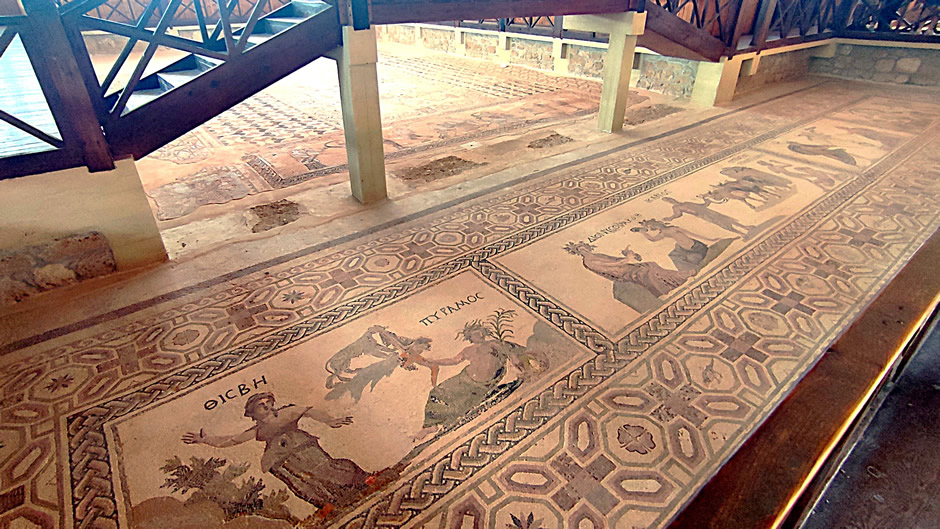 Above: Sample photos of mosaics at the Archaeological site of Nea Paphos from the House of Dionysos, the House of Aion, and the House of Theseus respectively. The latter Roman mosaic, seen lower-right in the photo dates from 3rd-4th century AD and depicts the myth of Theseus slaying the Minotaur in the Labyrinth of Crete.