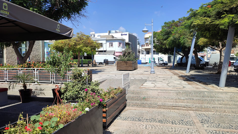 Above: The image shows a street in Limassol, Cyprus, near the Saripolou Square area. The sign visible on the left side of the image says "AGORA," which is a reference to the Limassol Municipal Market (also known as the "Pantopoulio"). This market is located in the heart of the historical centre of Limassol.
