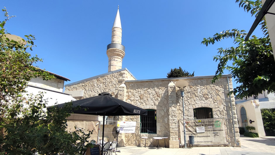 Built in the 16th century on the foundations of earlier Christian and Latin religious structures, it is the city's most prominent Ottoman-era mosque and remains an active place of worship for the Muslim community. The interior features six sections divided by columns and arches, and the site includes an adjacent ancient graveyard with notable burials. Recent excavations nearby revealed remnants of the 10th-century cathedral of Agia Ekaterini.