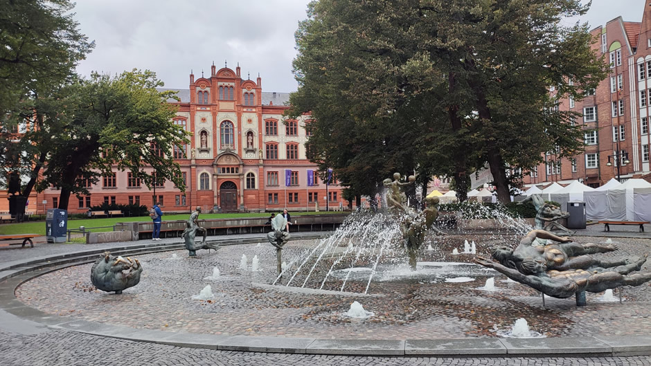 Above: The University of Rostock (on left); the Brunnen der Lebensfreude (“Fountain of joy of life”) sits in front of the old university on Universitätsplatz in the centre of Kröpeliner Straße.