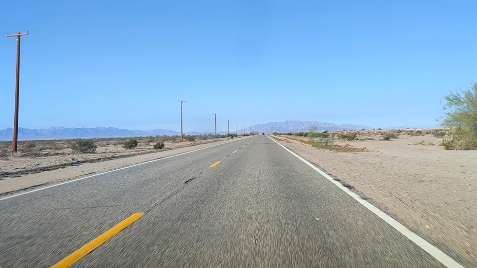 Above: On the Road - Travelling westwards along California State Route 62, approximately 11 miles southwest of Vidal Junction. Along this stretch of highway, there are no services for 100 miles (until the city of Twentynine Palms).