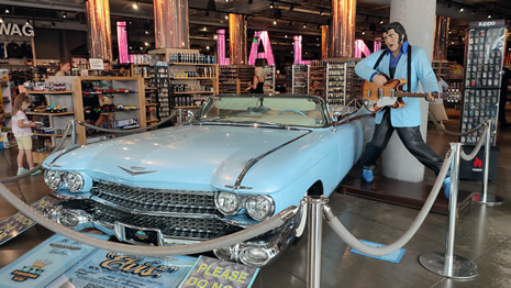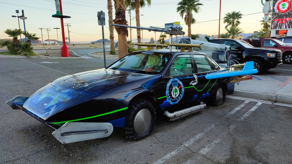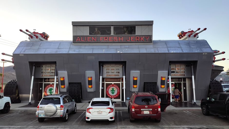 Alien Fresh Jerky (above) is a themed jerky store founded in 2000, now expanded into a sci‑fi attraction with alien statues and the Alien Jerky Car, a UFO‑styled vehicle parked outside (below). The store itself has a large selection of “Alien Fresh Jerky”, alongside a huge selection of “Area 51 Souvenirs”.