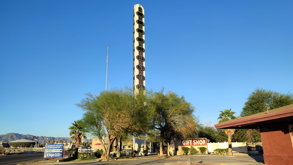 “The World’s Tallest Thermometer”, above, is a 134‑foot steel landmark built in 1991 to commemorate the record 134°F temperature once recorded in nearby Death Valley.