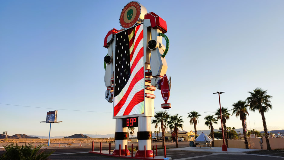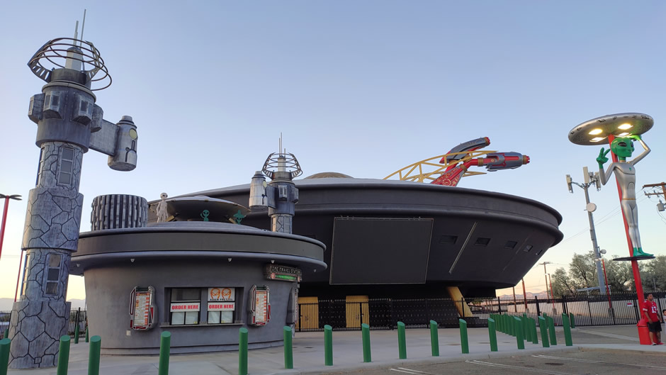 The UFO Hotel behind Alien Fresh Jerky (shown below) is a new venture in Baker, designed in the shape of a landed mothership with plans for themed rooms, dining, and retail.