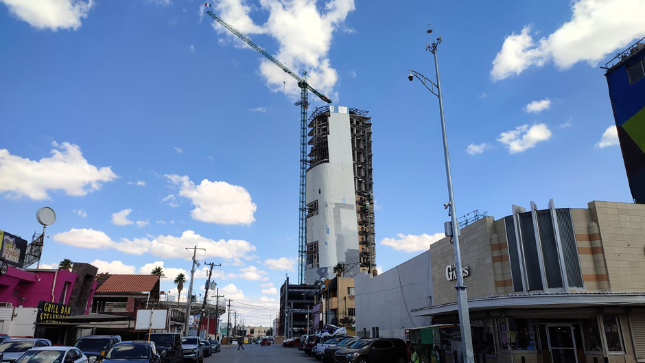 Above: The Torre Centinela (Sentinel Tower), a 20-story security nerve centre under construction at the time of the visit. It is designed to be the tallest building in the border region, serving as the command hub for the state's massive surveillance system (Plataforma Centinela) using thousands of cameras, drones, and AI to monitor criminal activity and enhance security. Construction began in August 2022 and as of late 2025, the tower was nearing the final phases of construction.
