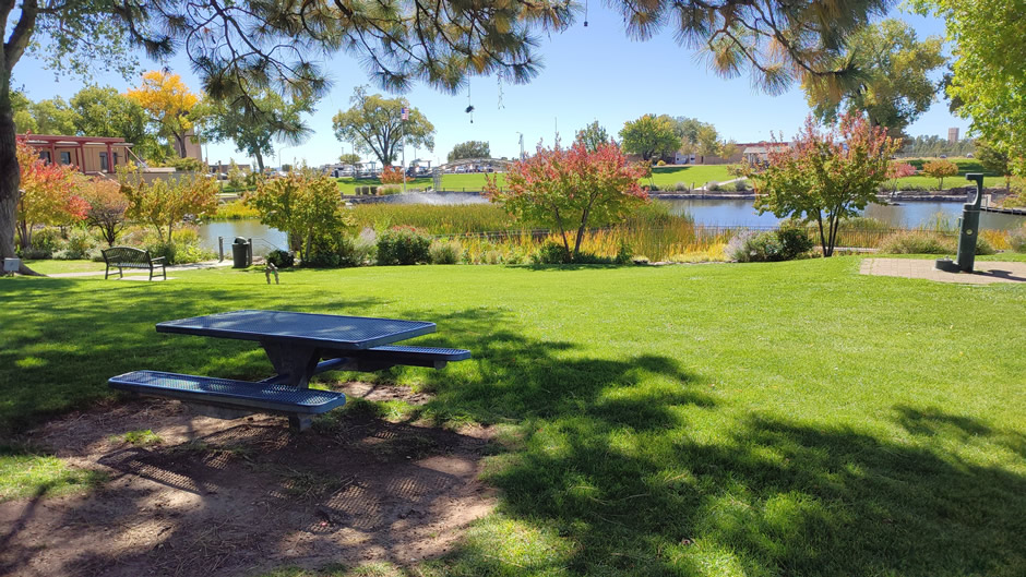 Ashley Pond Park (shown below) is a central gathering place named after homesteader Ashley Pond Jr., the founder of the Los Alamos Ranch School. During the Manhattan Project, it was surrounded by key facilities and community buildings. Today it is a public park with memorials and interpretive signs. And not to be confused with the park’s namesake, the park features an actual pond that serves as a central, idyllic feature. The park remains at the heart of Downtown Los Alamos.
