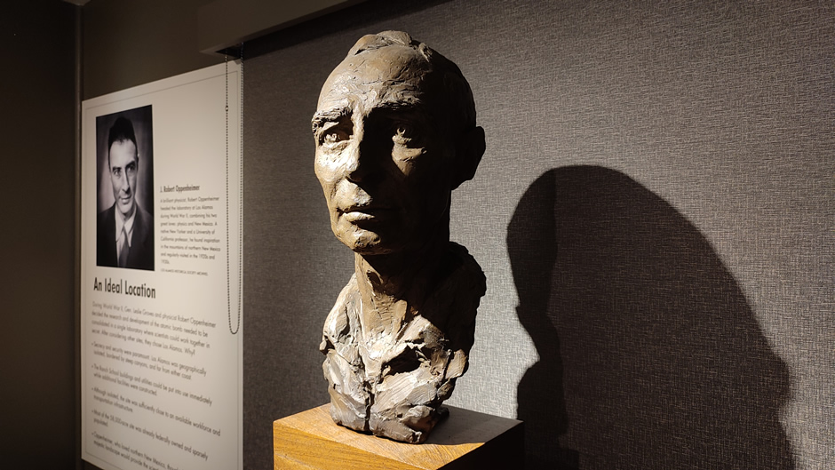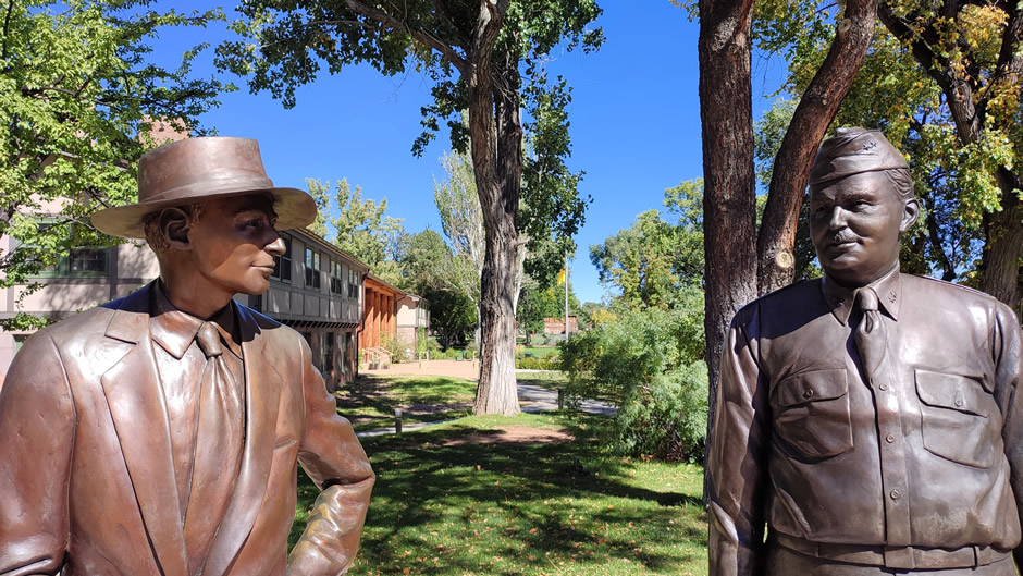 Bronze sculptures of J. Robert Oppenheimer and General Leslie Groves stand together in Downtown Los Alamos. They commemorate the partnership between scientific and military leadership. The statues are a popular photo stop on the walking tour. They symbolize the collaboration that defined the Manhattan Project.