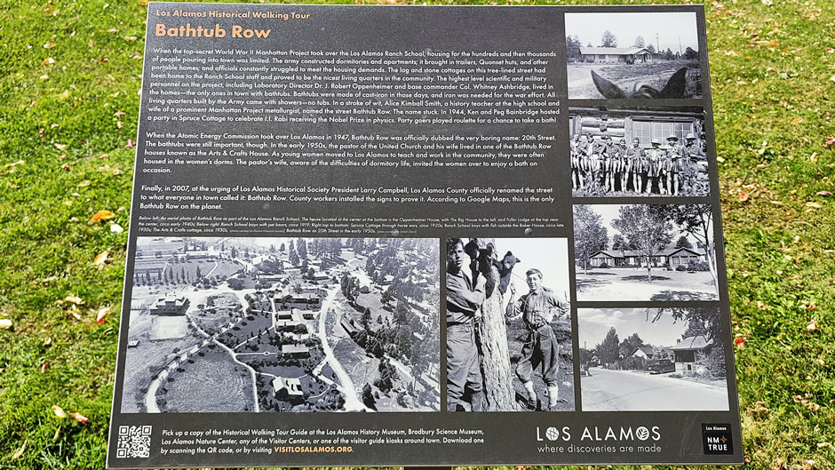 Bathtub Row is a line of historic homes which were reserved for senior staff during the Manhattan Project. The name comes from the fact that these houses had bathtubs, a rare luxury at the time. Many prominent scientists lived here, including Oppenheimer. The row remains a symbol of the hierarchy within the wartime community.