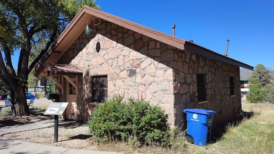 The Fire Cache (below) was a stone firehouse built in the 1920s for the Los Alamos Ranch School. It stored a hand-drawn fire cart equipped with a water tank, pump, and hose, used to fight fires in an era when drought and wood-burning stoves made the campus especially vulnerable. Unthinkable today, It was constructed by local homesteader Severo Gonzales Sr. using stone taken from the nearby Ancestral Pueblo site, giving it a distinctive local character.