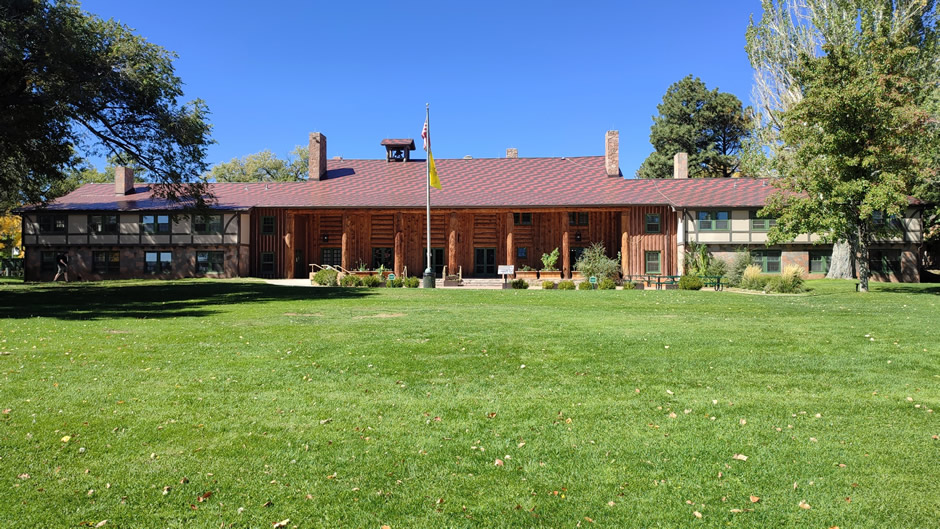 Fuller Lodge (below) is a rustic log building that served as a dining hall and meeting place during the Manhattan Project. Originally built for a boys’ school, it became a central hub for community life. Many scientists and families gathered here for meals and events. Today it is preserved as a historic landmark.