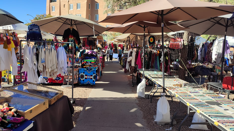 Above: A market featuring Native American art and jewellery, located between La Fonda on the Plaza and Loretto Chapel in Santa Fe.