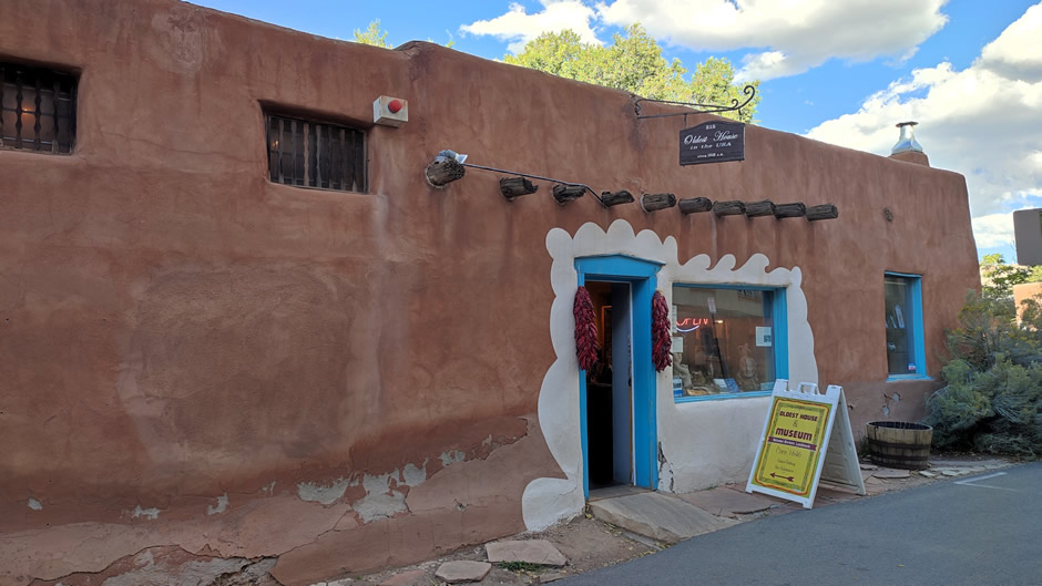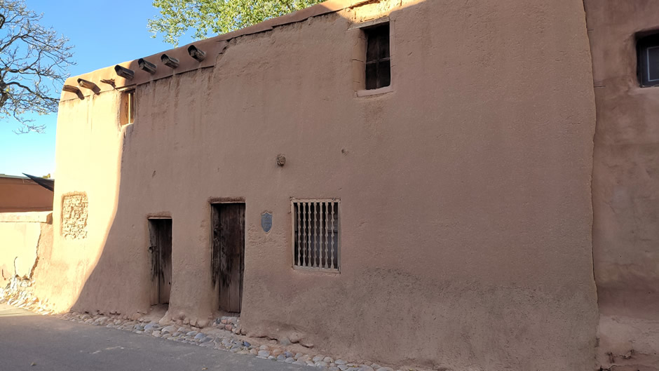 The De Vargas Street House (shown below), often called the Oldest House, is located in Santa Fe’s Barrio De Analco Historic District. Archaeological studies suggest parts of its adobe walls may predate Spanish colonization, making it one of the oldest structures in the country – later construction dates to the 1600s. Today, it serves as a small museum and shop.