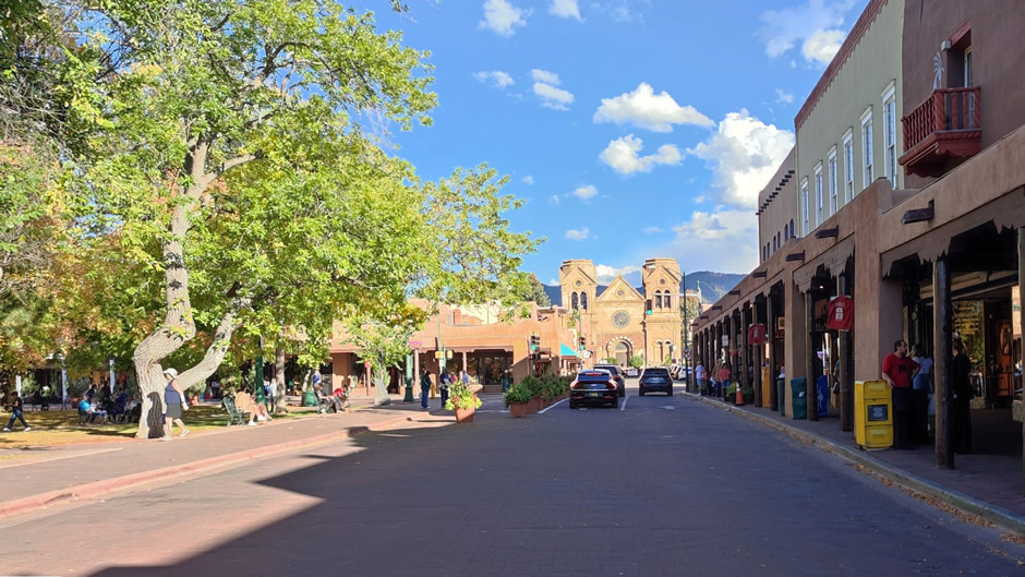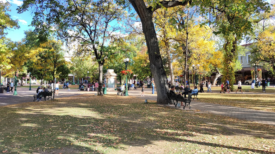 Santa Fe Plaza (shown below) has been the city’s cultural and civic heart since its founding in 1610. The plaza serves as a gathering place and is surrounded by shops, galleries, and historic buildings. For over 150 years, it featured the Soldiers’ Monument, an obelisk dedicated in 1868. The monument was toppled in 2020 during protests, and as of the time of the visit, no statue stands there, reflecting ongoing debates about history and representation.
