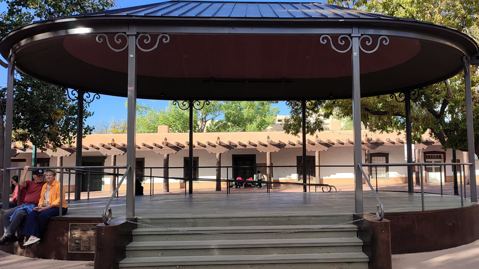 The Palace of the Governors (shown behind the Santa Fe Plaza Bandstand, below) was built in 1610. This adobe structure is the oldest continuously occupied public building in the United States. Today it serves as part of the New Mexico History Museum, with Native American artisans selling jewellery and crafts along its portal.