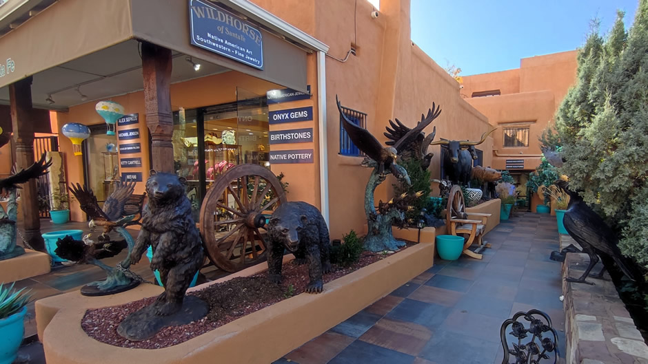 On this visit, a suitable parking lot was found near the New Mexico State Capitol, and the downtown area was explored on foot. The walk into Downtown Santa Fe highlighted the city’s distinctive blend of Pueblo and Spanish Colonial architecture, with buildings marked by adobe construction, flat roofs, and exposed wooden vigas (timber rafters). The route led to Santa Fe Plaza, the bustling heart of the city where there are various shops (including places selling Native art), restaurants specialising in New Mexican cuisine, and a variety of small cafés. This district illustrates centuries of cultural exchange, with historic structures standing alongside modern businesses, forming a compact and walkable centre. Some points of interest seen follow: