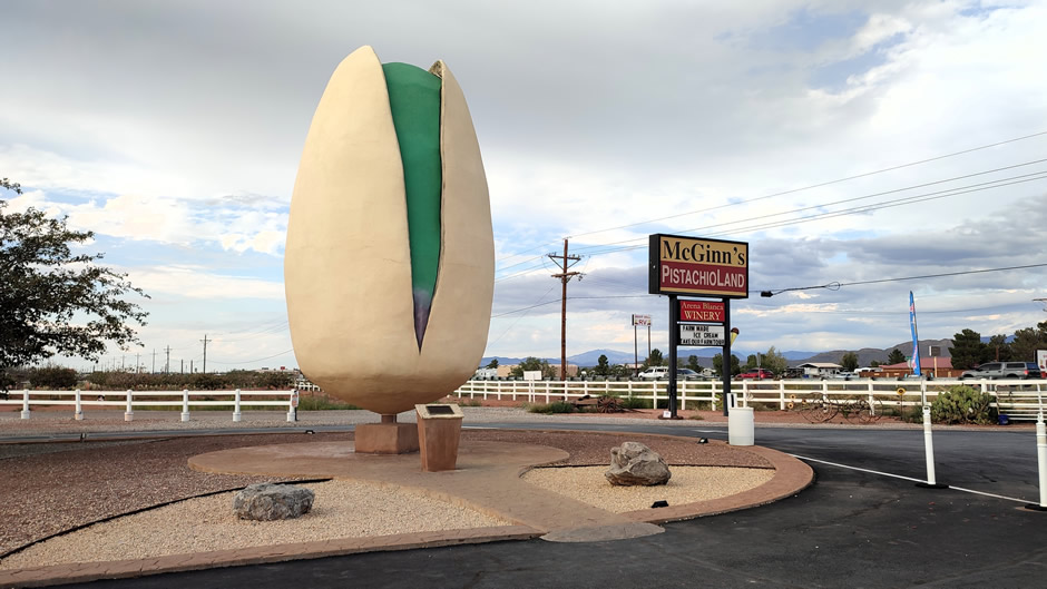 7 miles north of Alamogordo, road trippers may well find themselves stopping off at McGinn's PistachioLand (also advertised as “PistachioLand U.S.A.”) to see the world’s largest pistachio nut. Like many oversized roadside attractions, the giant pistachio was designed to catch the attention of travellers and encourage passers-by to stop and explore the site.