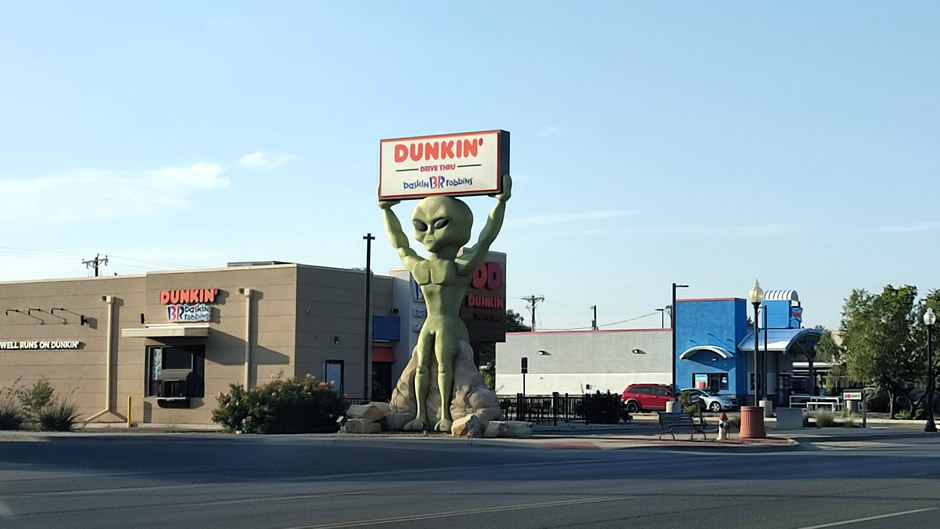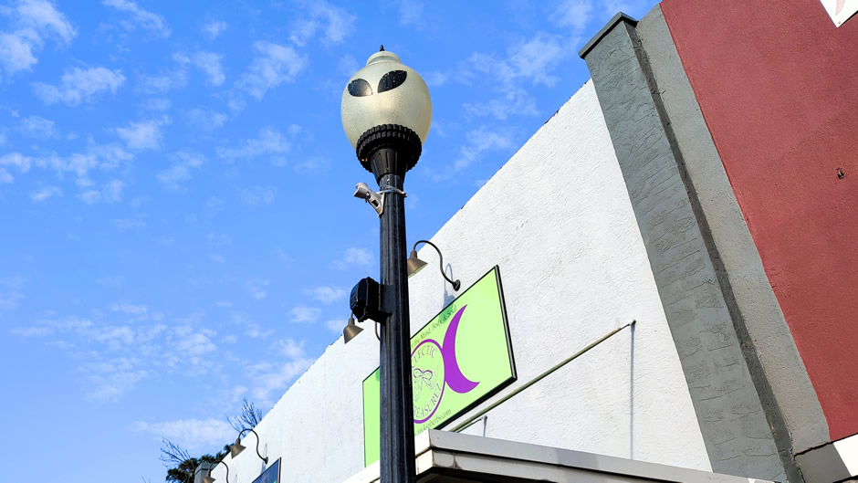 Above: Roswell features iconic alien-themed streetlights, particularly along Main Street, designed as green alien heads, enhancing the town's extraterrestrial branding and attracting tourists interested in the famous 1947 UFO incident. These distinctive lamps glow green at night, adding to the otherworldly atmosphere of the town famous for its UFO lore.