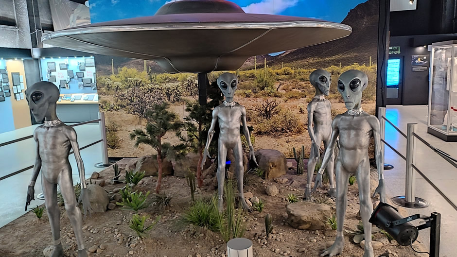 The Roswell Visitor Center (shown below), located in Downtown Roswell, serves as the starting point for exploring the town’s famous UFO heritage. Inside, visitors will find helpful staff, maps, and information on local attractions, along with souvenirs themed around the 1947 crash. A popular highlight is the chance to take a free photo with life-sized alien figures, making for a fun keepsake. The centre also provides guidance on other “alien spots” around town, ensuring guests can easily navigate Roswell’s unique mix of history, culture, and extraterrestrial lore. Additional information is available on other aspects of the city, including non-alien attractions and history.