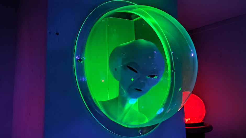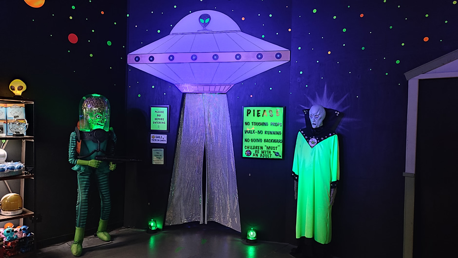 Created by artist Bryan Ward, the attraction features glowing retro sci-fi scenes, alien landscapes, and interactive installations that transport guests into a cosmic environment. After completing the walkthrough, visitors can explore the adjoining gallery showcasing Ward’s original artwork, along with unique vintage-style toys, lamps, and souvenirs. Family-friendly and visually striking, the Spacewalk blends Roswell’s UFO heritage with creative art, offering a fun and memorable stop for all ages.