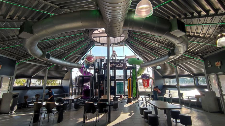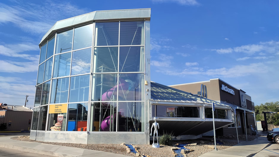 Amongst other businesses in the city with a UFO-twist, Roswell is home to the world’s only UFO-themed McDonald’s (shown below). This flying-saucer-shaped restaurant was built in 2005 and has become a quirky landmark. The silver saucer exterior glows with neon lights at night, while inside the space-themed Playland features Ronald McDonald and friends in astronaut suits.