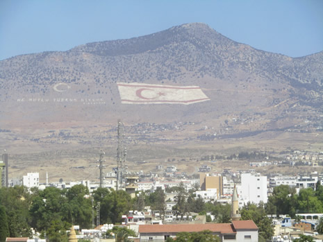 Among the city's landmarks, the Shacolas Tower Museum and Observatory offers a panoramic view of Nicosia, giving a sense of the city’s size and its division. From here, it was possible to get a clear view of a massive flag of the Turkish Republic of Northern Cyprus, which has been controversially painted on the side of the southern face of the Beşparmak (Five Finger) mountain range, near Kaynakköy. The flag overlooks Nicosia and serves as a prominent symbol of Turkish Cypriot identity and a reminder of the island's division. Constructed in the 1980s, it mirrors the Turkish flag and features the Atatürk quote "Ne mutlu Türküm diyene" (How happy is one who says I am a Turk). It is illuminated at night, making it a highly visible landmark.