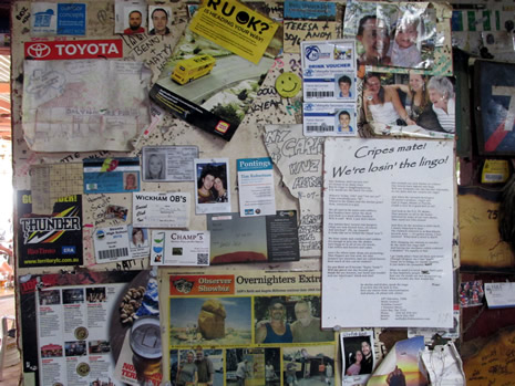 The Daly Waters Pub (above), previously mentioned, was constructed by Bill Pearce using Cypress Pine, which is resistant to attack by termites. Forming the centrepiece of the township, its interior today is certainly worth a visit as it contains a bewildering array of business cards, t-shirts, bras, banknotes, licence plates and all sorts of memorabilia from passing travellers wishing to leave their own mark (as did this page's author!). The pub has had a liquor licence since 1893 and is a popular place to stop for people travelling up or down the Stuart Highway. This far flung outback establishment is well known for its "world famous" Beef & Barra which is served from the BBQ every evening from April to September. At other times, a range of meals are also available, including barra burgers.