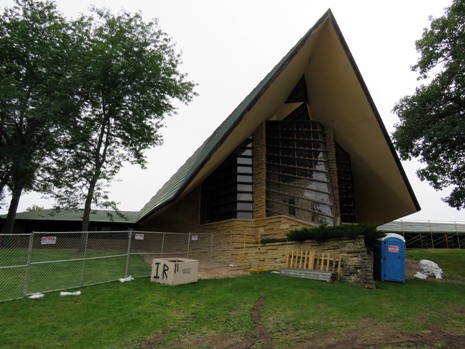 What a lovely title. This building, at the time of the visit was somewhat limited for taking photographs outside, due to it undergoing external renovation works. Furthermore, after asking a lady who had keys and had just entered the building, it was not possible to go inside and take a look at the interior. Wright was approached by the First Unitarian Society of Madison to design a new building for their worship in 1946. It took him a year and a half to come up with the fieldstone and glass triangle design. The building was completed in 1951 and the design has much originality and shows a genuine appropriateness for the purpose for which it was built. The dynamic glass apse, sheltered by a folded copper roof is tall enough to take away the need for a separate bell tower. Wright later compared the prow-like apse and sheltering eves to the hands of a supplicant in prayer emerging from their habit. Some more information and photographs may be found on this website on the Madison page Here (thumbnail gallery photos 39-62). Next on this page, another church designed by Wright and this time, back to Chicago...