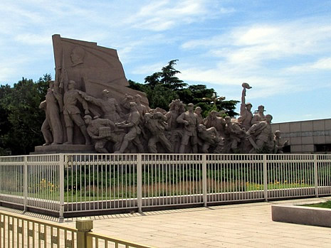 The Mao Zedong Memorial Hall, or Mao Zedong Mausoleum, stands in the square towards it’s southern end and just south of the Monument to the People’s Heroes. The hall was completed 1977 shortly after Chairman Mao Zedong, the founder of the People’s Republic of China, died (in September 1976) and here, his embalmed body lies in state. Like Lenin’s Mausoleum in Moscow’s Red Square, it is open to the public to view the waxy-looking former leader, except for certain times of the year when the body is undergoing maintenance. For a biography on Mao Zedong (sometimes written as ‘Mao Tse-tung’), click here (external link). Outside the memorial hall stand sculptures which supplement the artistic rendering of national struggle re2opresented on the nearby Monument to the People's Heroes.